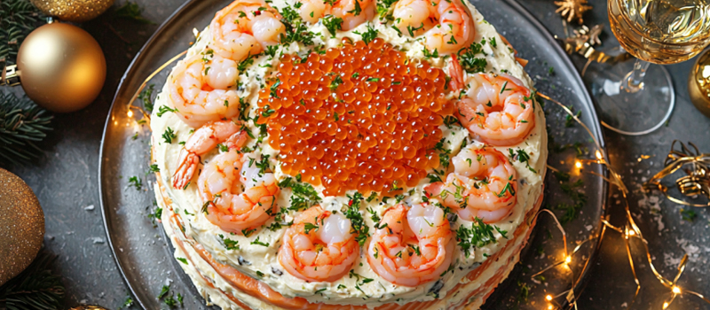 Ингредиенты: отварной картофель — 2 шт., яйца вкрутую — 2 шт., слабосоленая красная рыба (семга, форель) — 150 г, свежий огурец — 1 шт., отварные очищенные креветки — 150 г, плавленый сыр — 2 шт., майонез. На большое плоское блюдо выложите первый слой из тертого отварного картофеля и слегка смажьте его майонезом. Вторым слоем распределите тертые яйца — их не смазывайте. Третьим слоем — нарезанную кубиками красную рыбу, четвертым — соломку огурца. Этот овощной слой немного смажьте майонезом. Пятый слой — целые или половинки креветок, их тоже не смазывайте. Завершающим, шестым слоем обильно покройте салат мелко тертым плавленым сыром, создавая эффект снежной шапки. Перед подачей дайте настояться в холодильнике 1–2 часа.